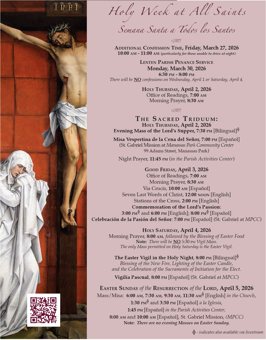 Evening Mass of the Lord’s Supper – Thursday, April 2 at 7:30 PM* Our bilingual Holy Thursday Mass will include the Washing of the Feet and Commemoration of the Institution of the Eucharist. Following Mass, we will process to the PAC for Silent Adoration until 11:45 PM, ending with Night Prayer. |